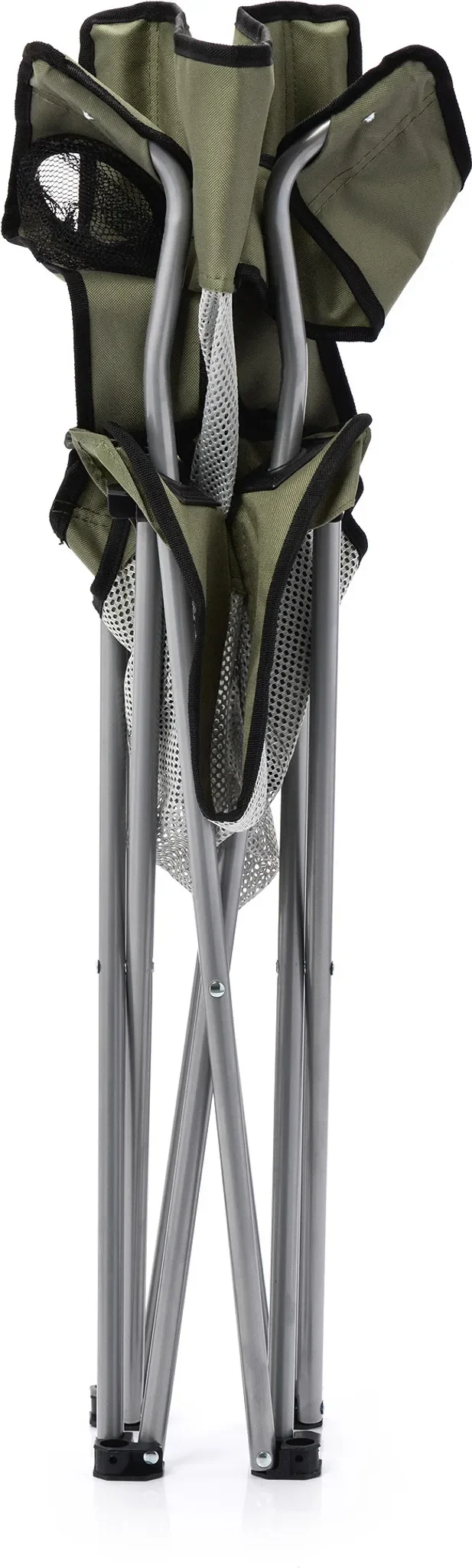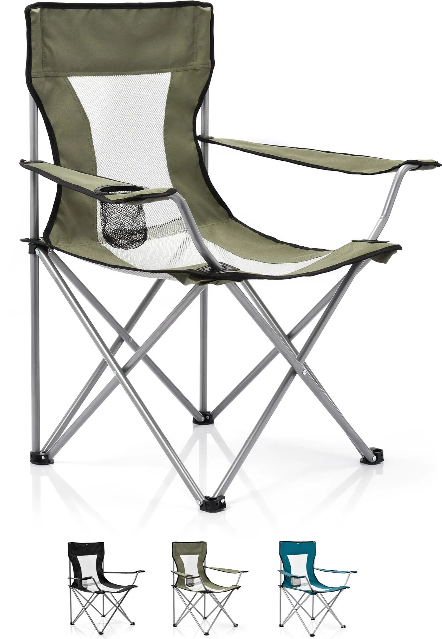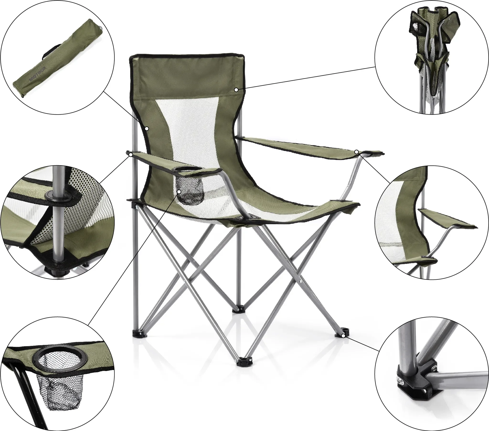 Die Sitzfläche aus wasserabweisendem 600D Polyester mit integrierter Netzstruktur sorgt für angenehme Belüftung, während der pulverbeschichtete Stahlrahmen Stabilität und Langlebigkeit bietet. Armlehnen mit integrierter Tasche ermöglichen es, kleine Gegenstände griffbereit aufzubewahren.