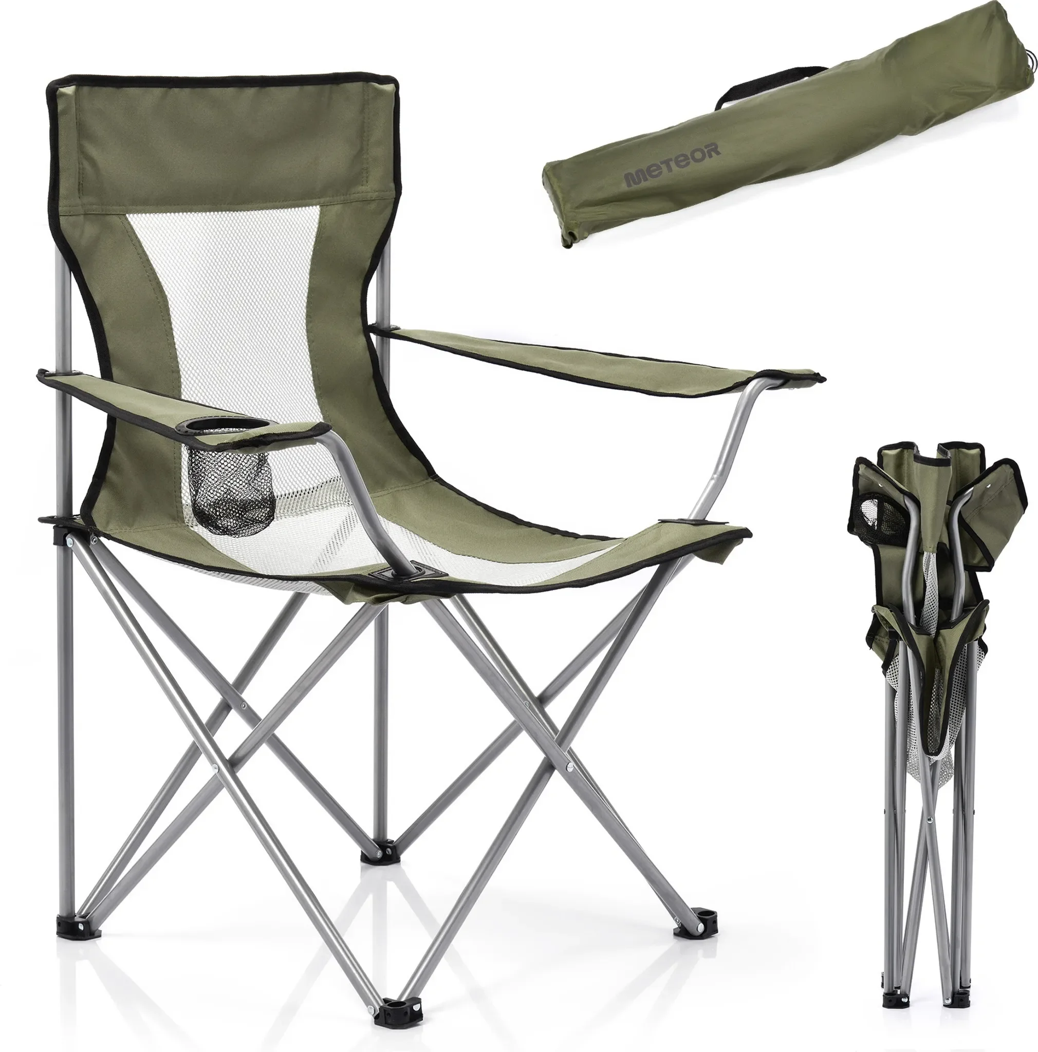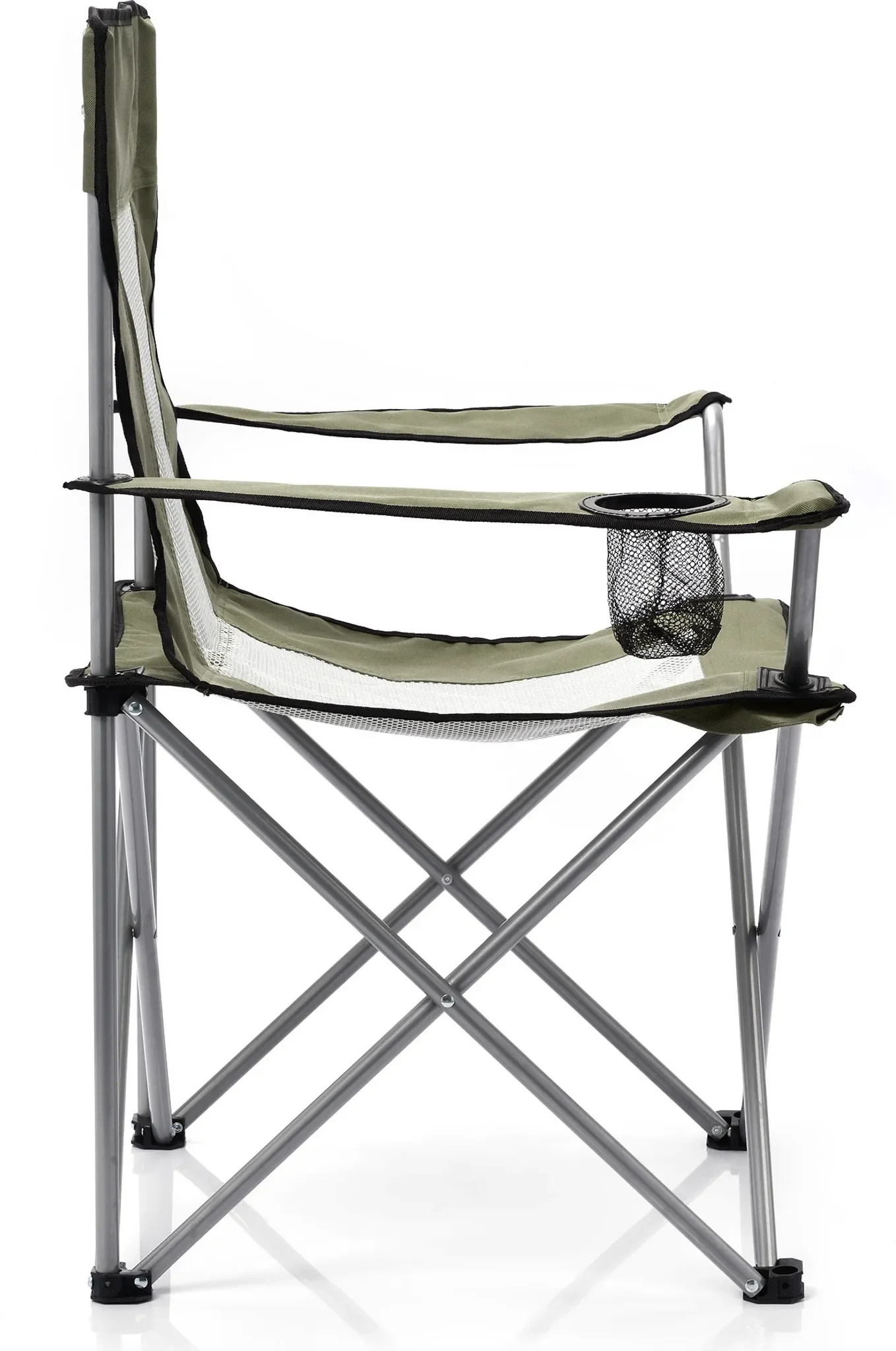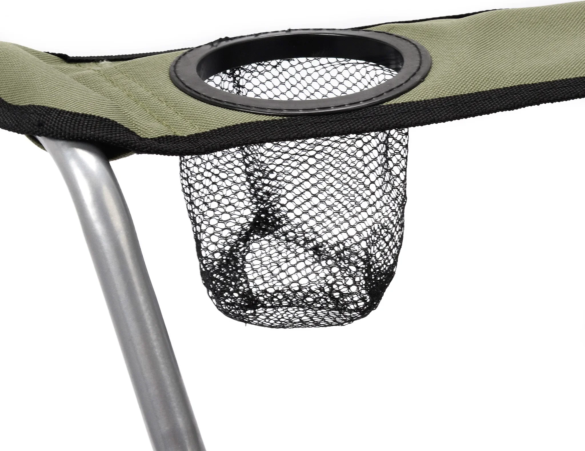 Die Sitzfläche aus wasserabweisendem 600D Polyester mit integrierter Netzstruktur sorgt für angenehme Belüftung, während der pulverbeschichtete Stahlrahmen Stabilität und Langlebigkeit bietet. Armlehnen mit integrierter Tasche ermöglichen es, kleine Gegenstände griffbereit aufzubewahren.