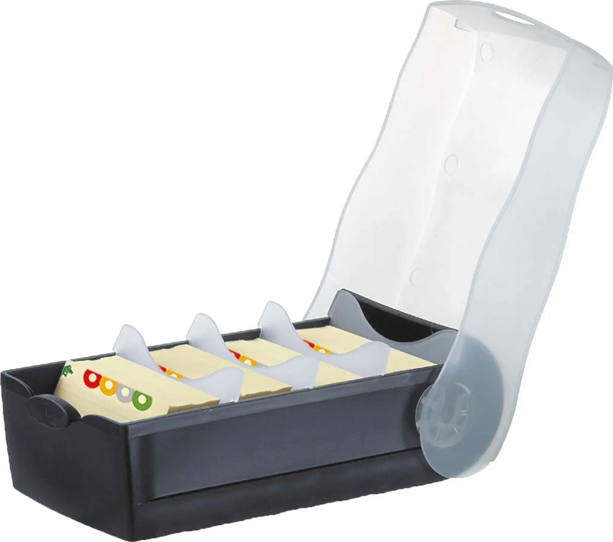 | Im Paket | 1 × Karteibox, 100 × linierte Karteikarten, 5 × variable Stützplatten, Beschriftungsschild |