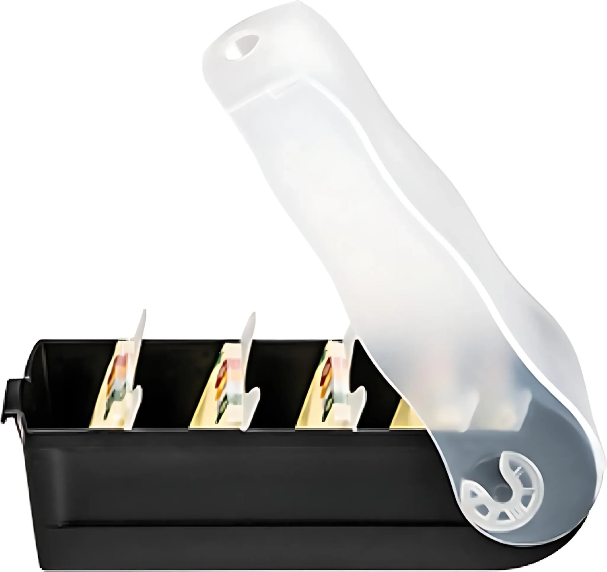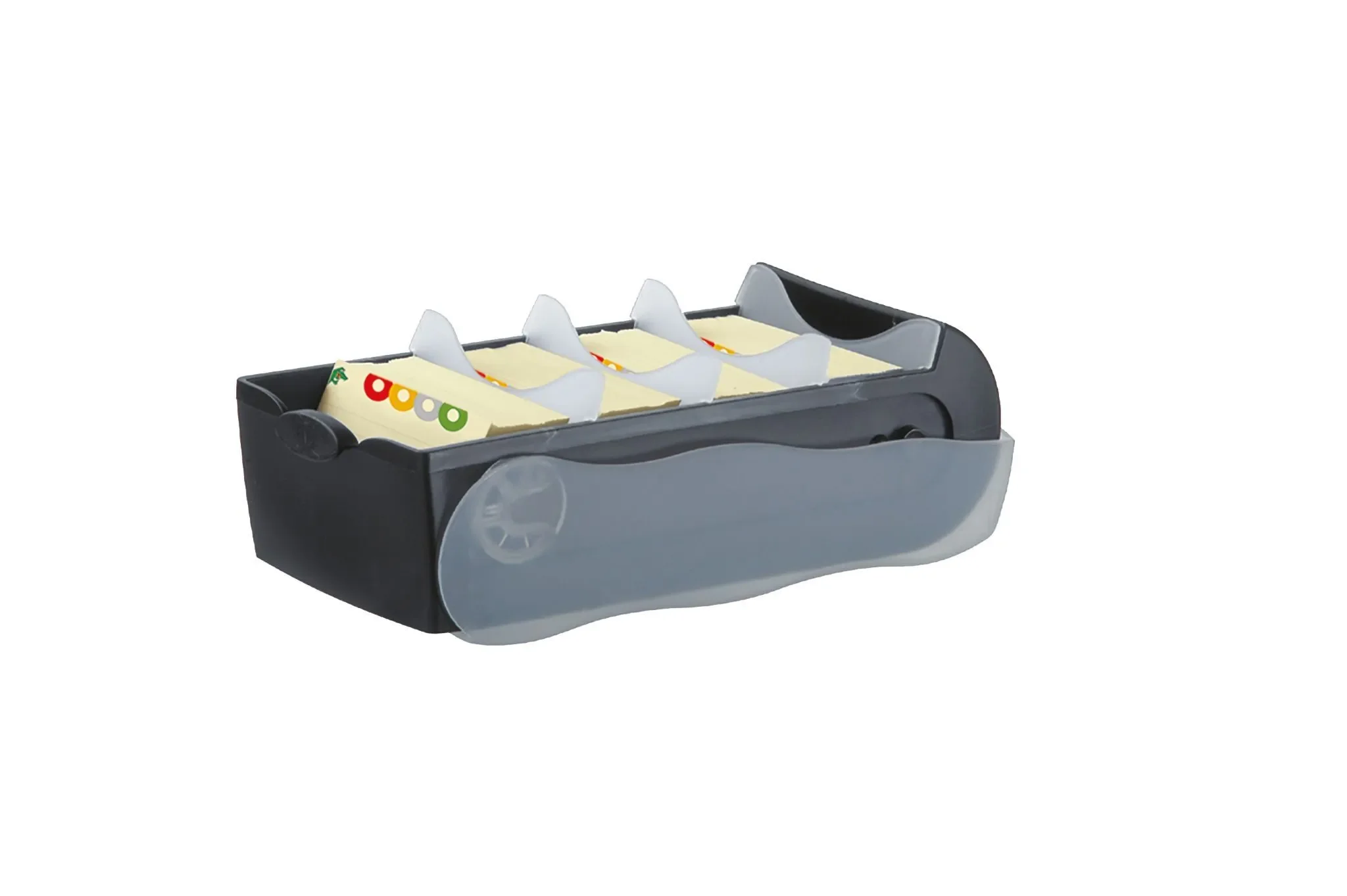 Beim Öffnen verschwindet der transluzente Deckel platzsparend unter der Box, im geschlossenen Zustand sind die Stützplatten sicher arretiert. Die robuste Verarbeitung aus hochwertigem Polypropylen sorgt für Langlebigkeit im täglichen Einsatz.