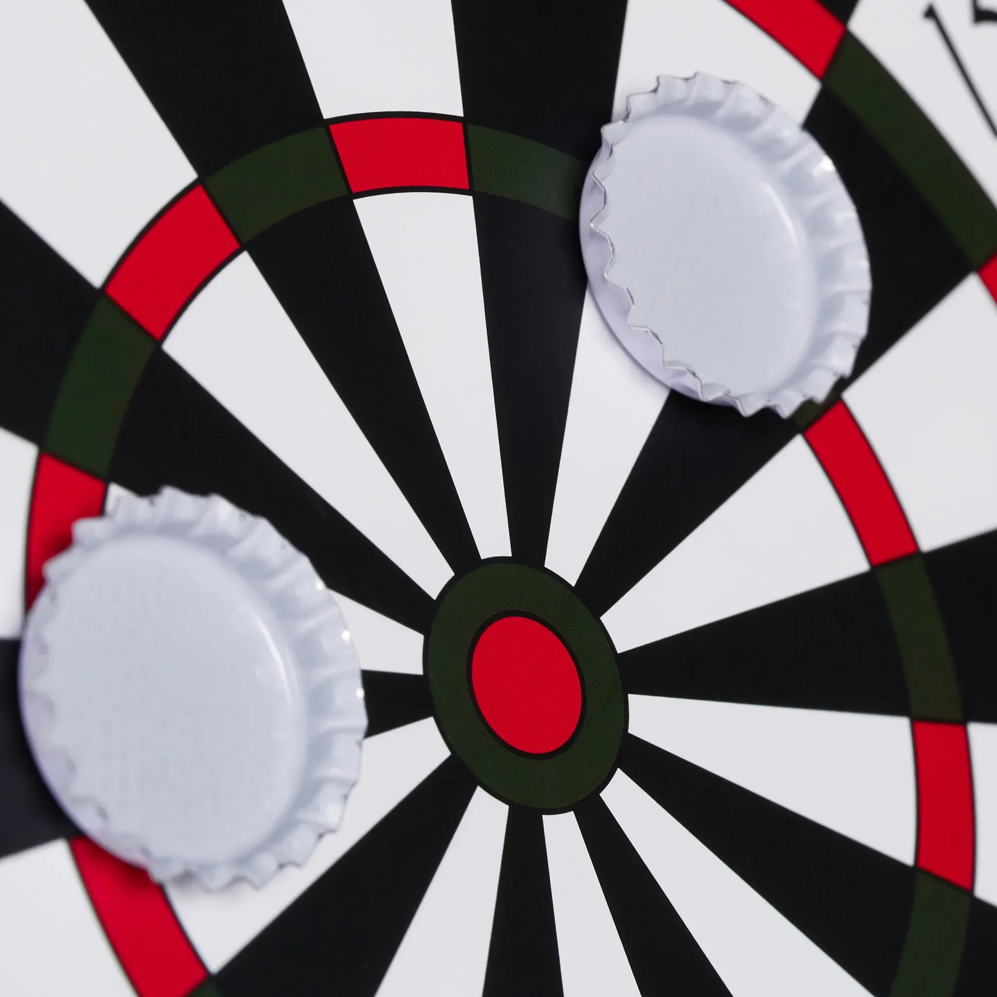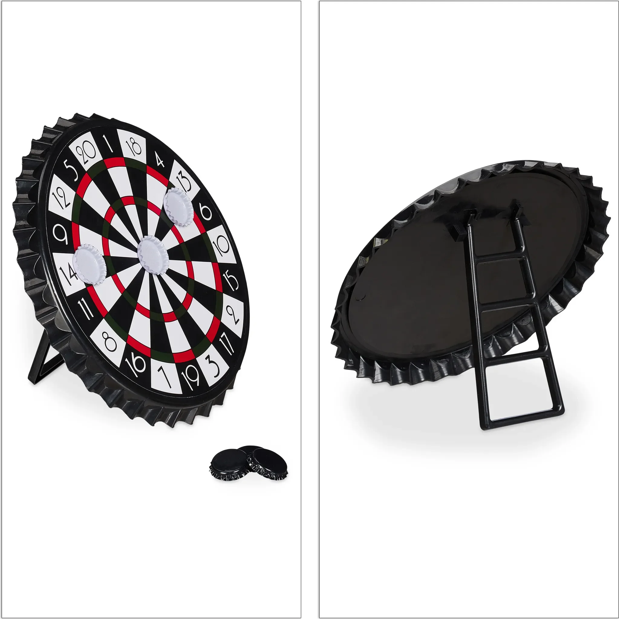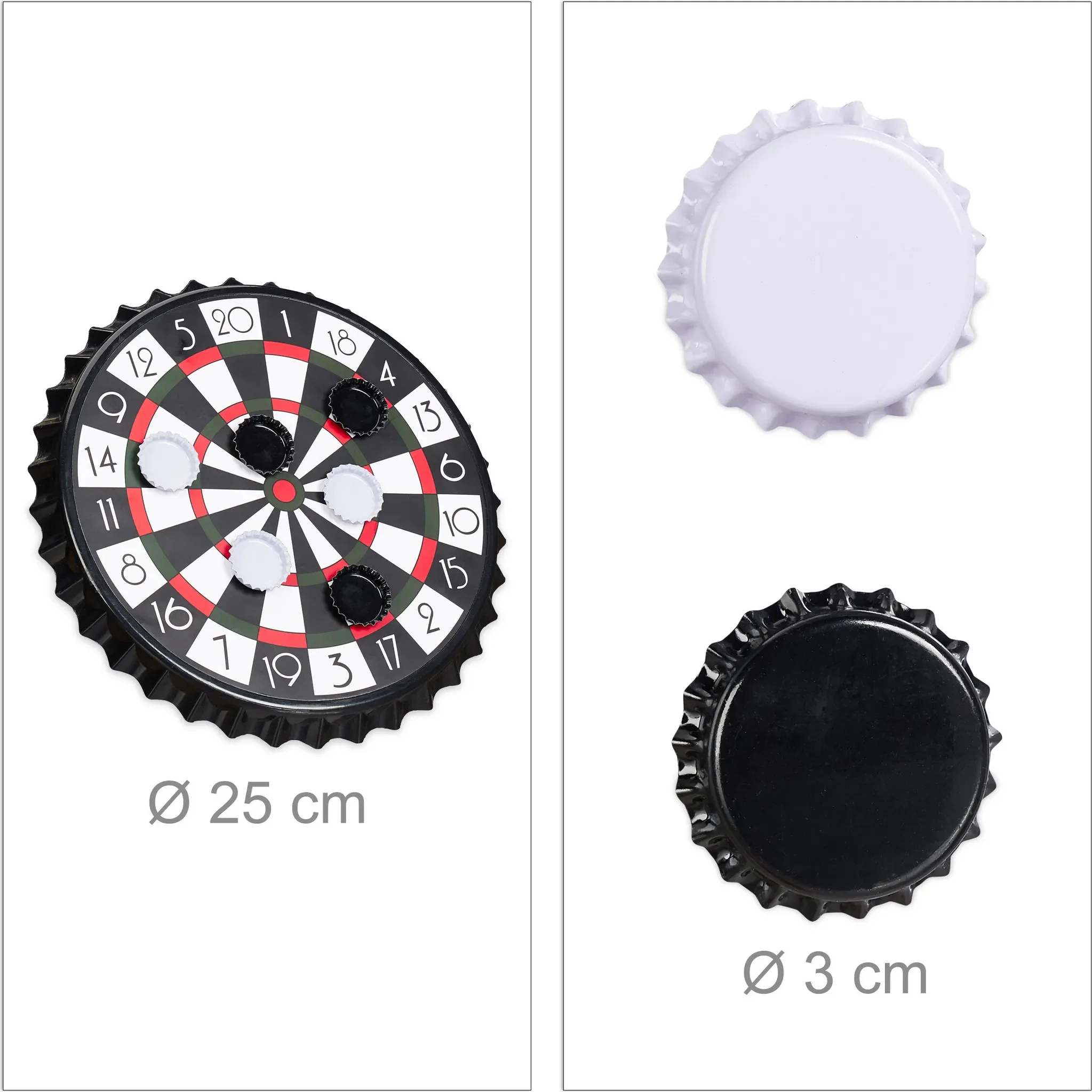 | Im Paket | 1 × Dartscheibe · 6 × Kronkorken (schwarz & weiß) |