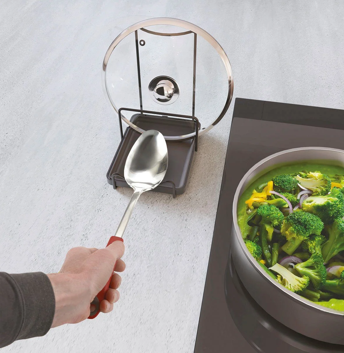 Highlights: Saubere Arbeitsfläche beim Kochen, stabile Halterung für Deckel, antistatische und rostbeständige Beschichtung sowie langlebige Qualität mit 5 Jahren Garantie.