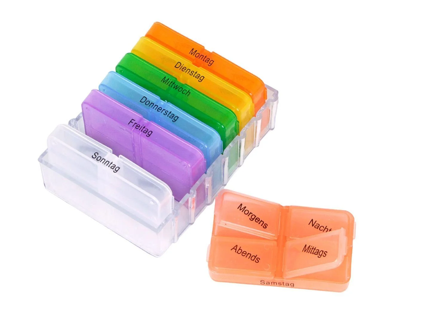 Highlights: Klare Tageszeit-Einteilung, herausziehbare Tagesmodule, farbliche Kennzeichnung und kompakte Reisegröße.